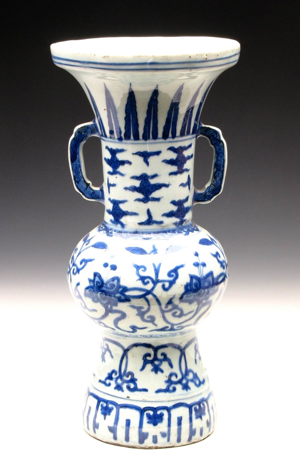 《明万历款青花串枝莲蕉叶双耳花觚》